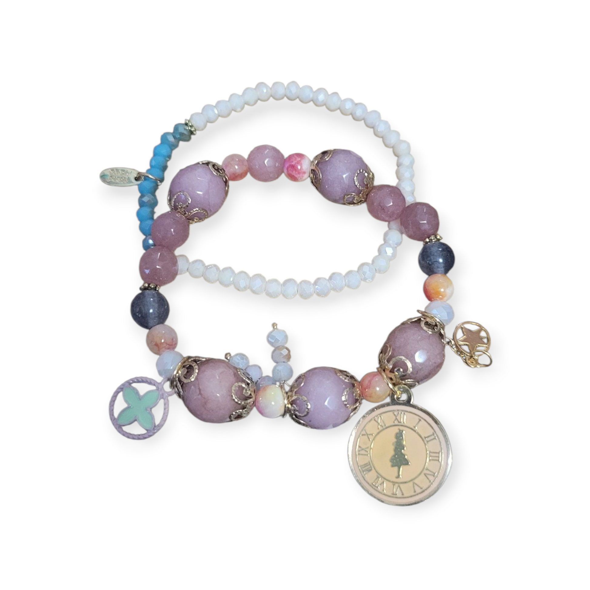 2-piece bracelet set features several beautiful charms including a roman numeral clock.