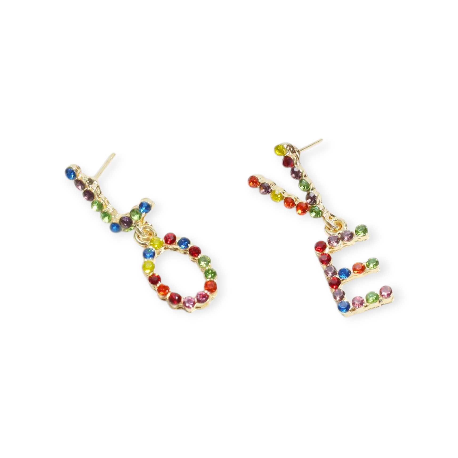 This dynamic earring duo features the word "LOVE" broken into two letters per earrings with colorful rhinestones.