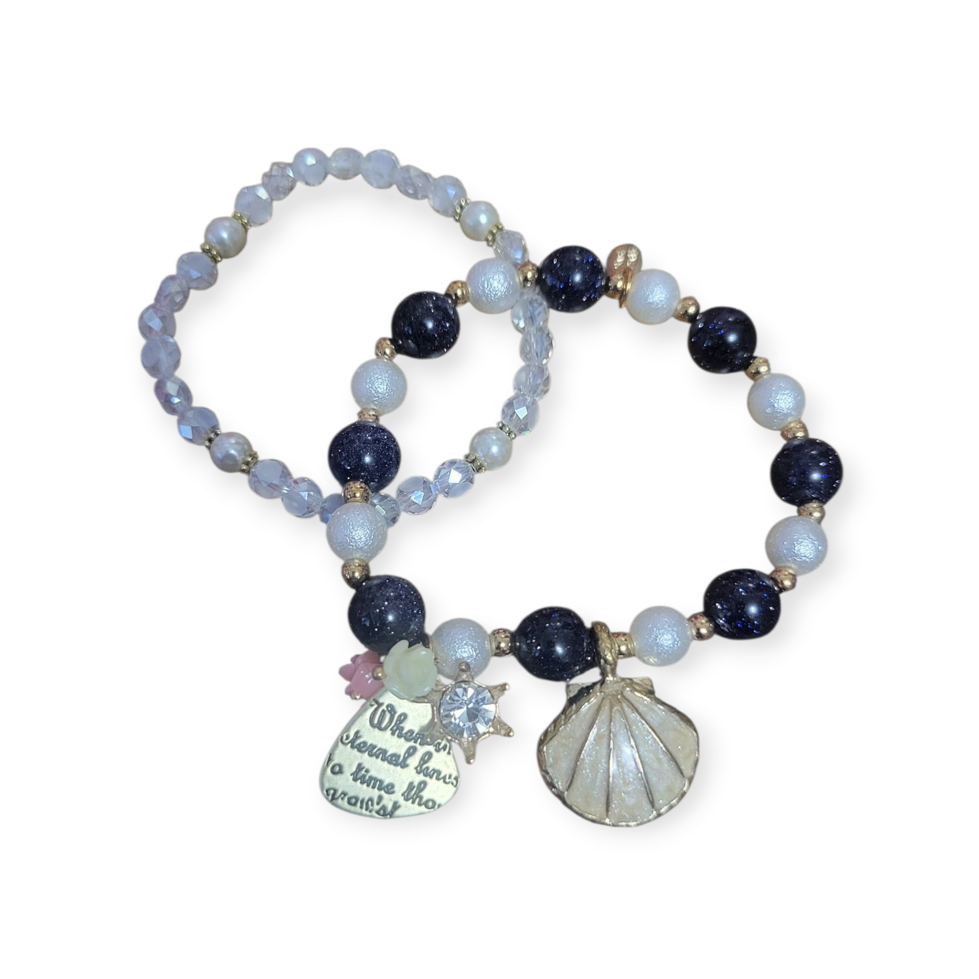 2-piece beaded bracelet set features multiple charms including a beautiful seashell.