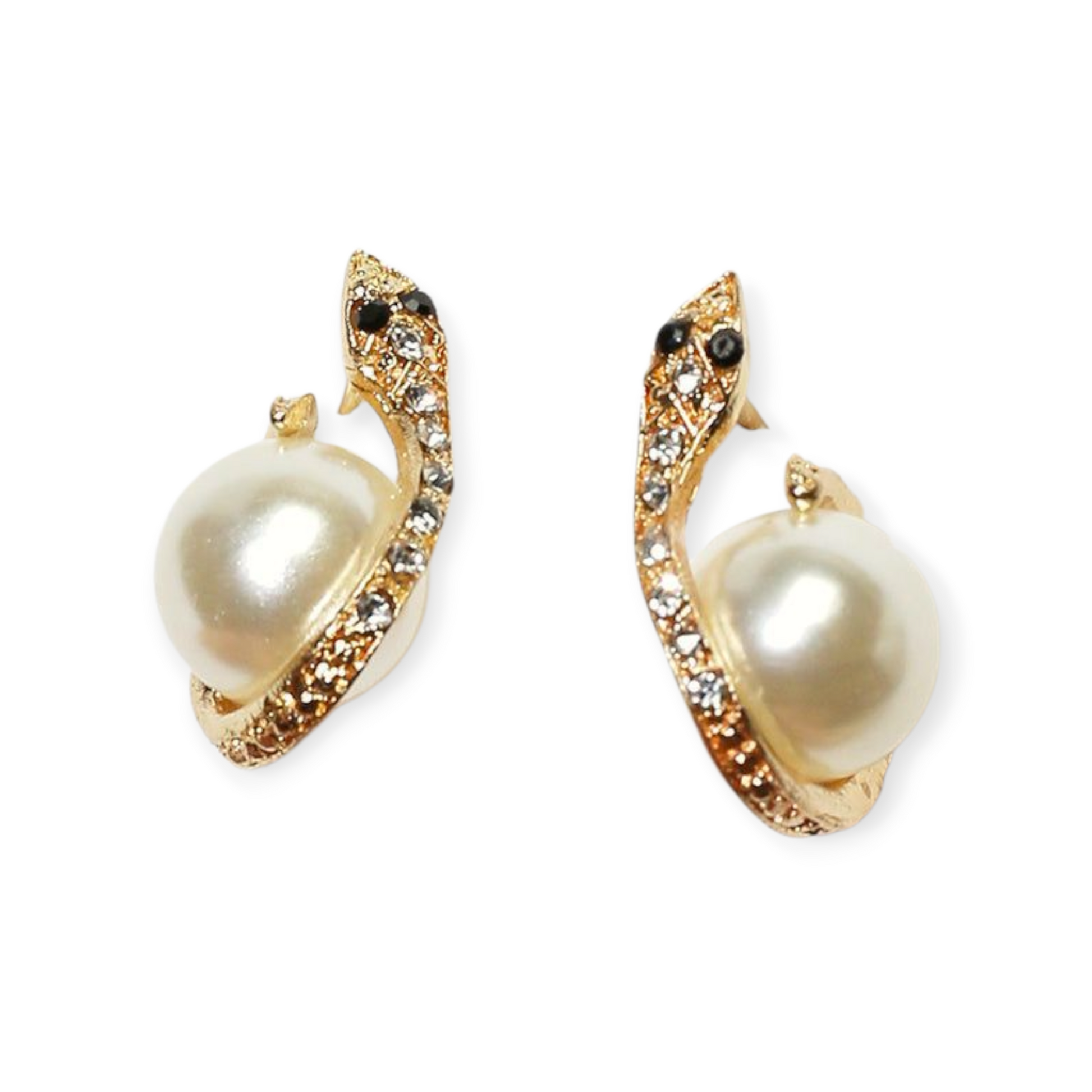 These gorgeous earrings feature a snake wrapped around a pearl on a post earring.
